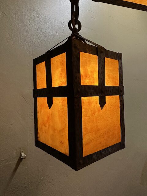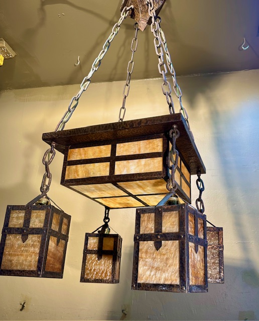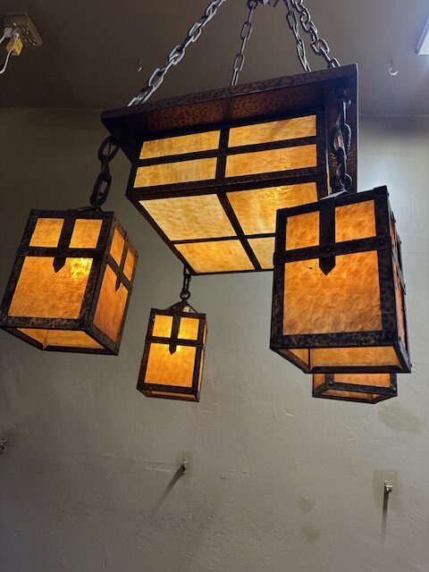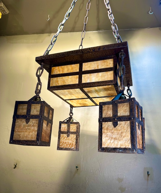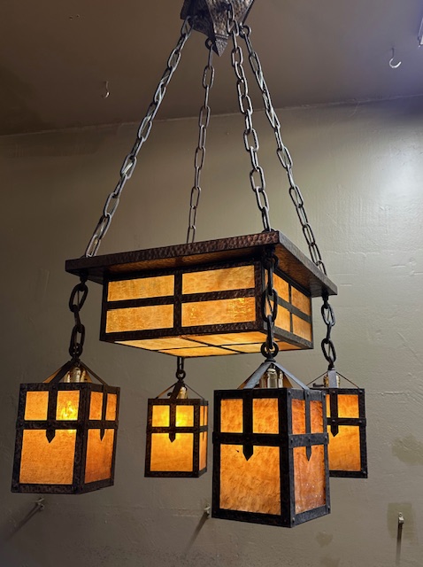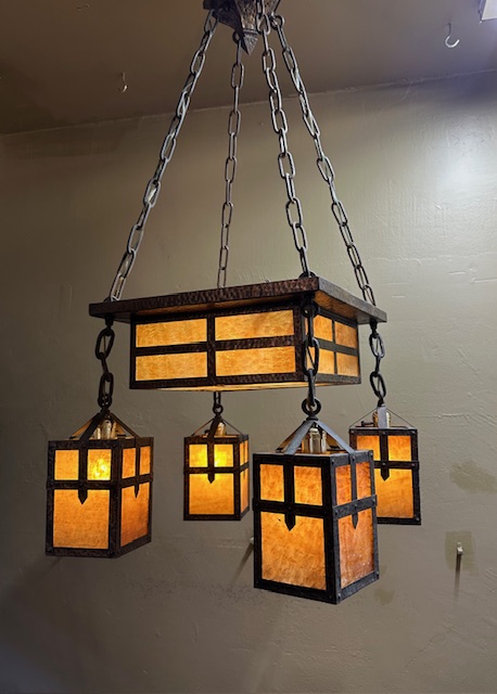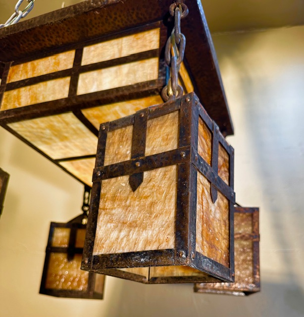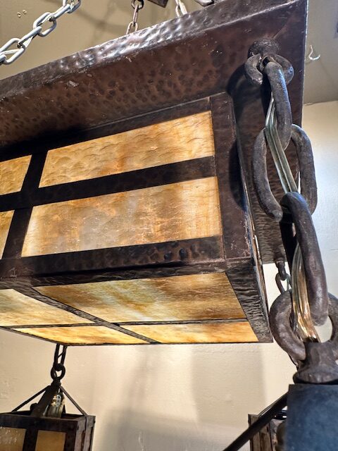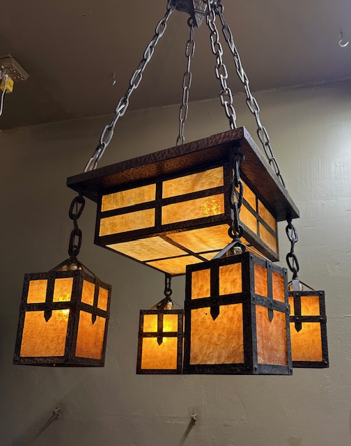 This original Mission / Arts & Crafts Chandelier was recently removed from a house on High Park Ave in Toronto. It dates from around 1915 and is in excellent condition. Hammered brass construction with lovely caramel slag glass. The glass gives off a wonderful warm glow when lit. Original fixtures like this are becoming increasingly hard to find.