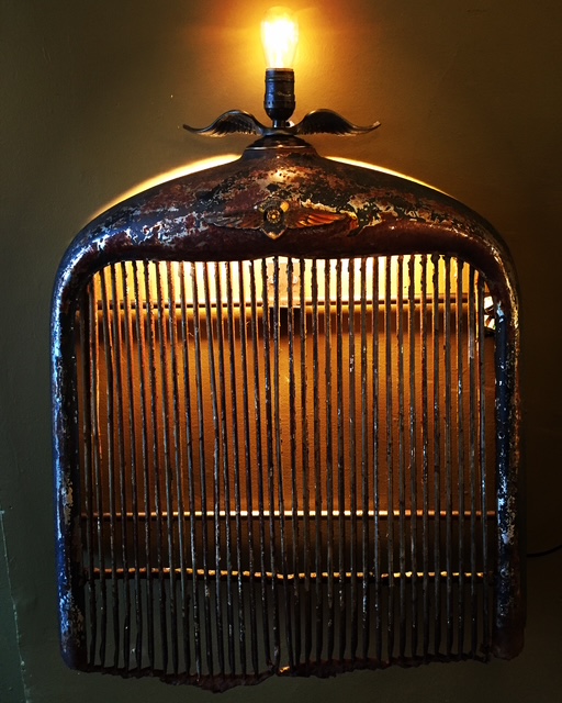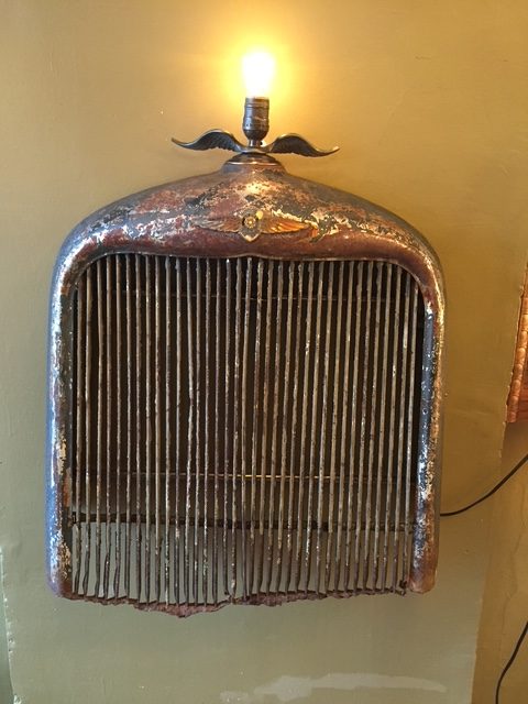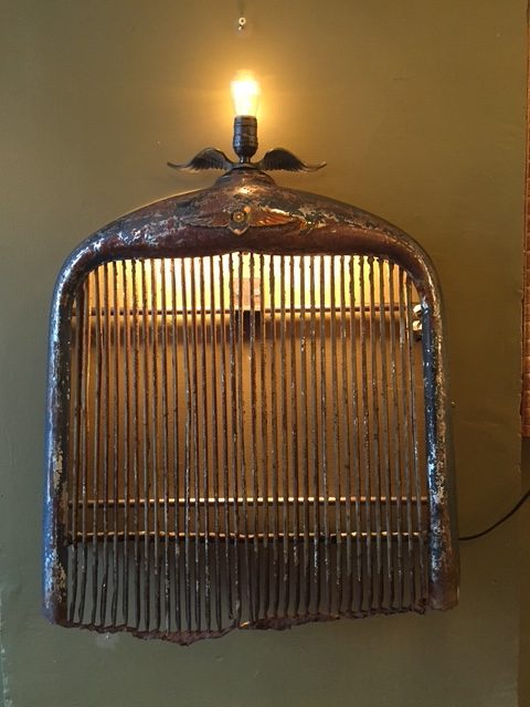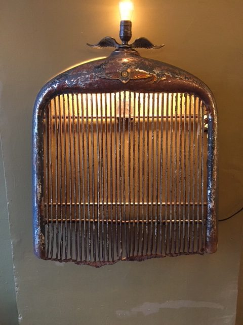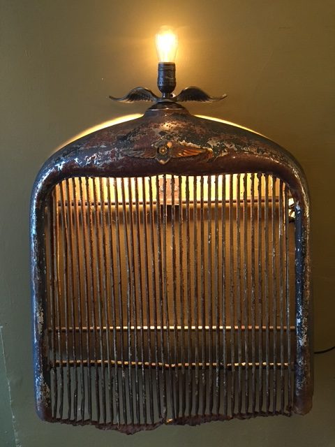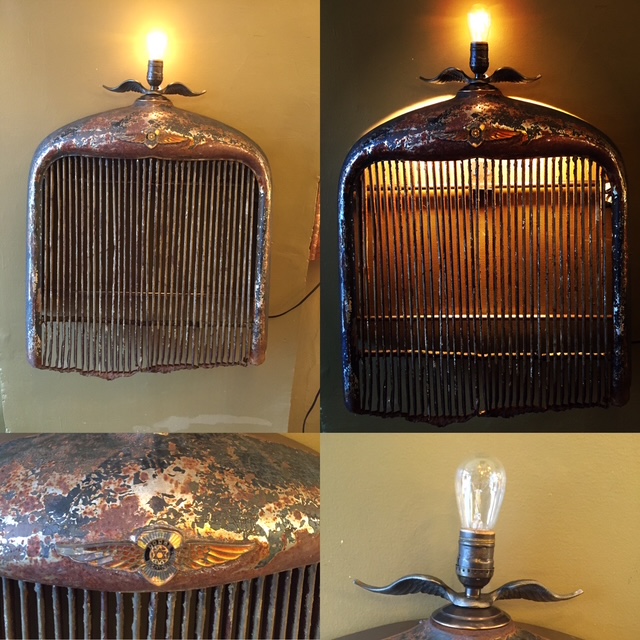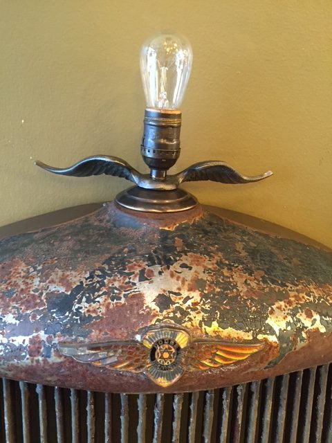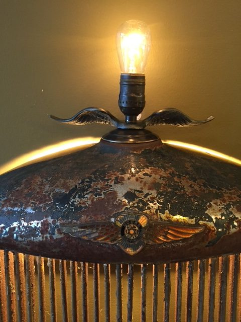 One of our custom creations. This is a 1930s Dodge Brothers truck grill that was salvaged from a scrap pile. We topped it off with a custom-made hood ornament light that was made with one of our signature angel wing castings. We’ve wired this with a three-way ON/OFF switch that will allow you to turn the back light or top hood ornament light individually, or both at once.