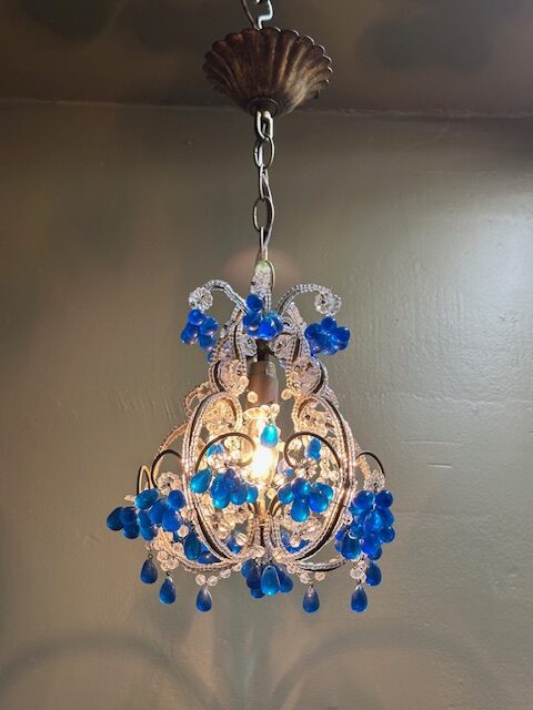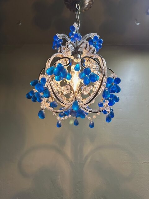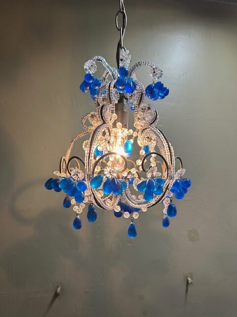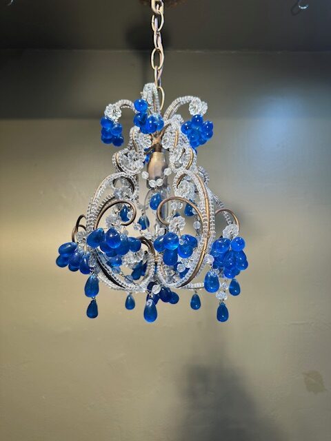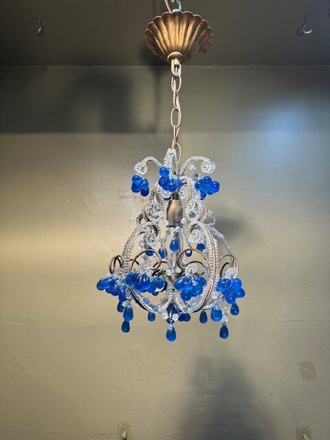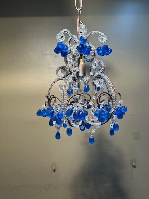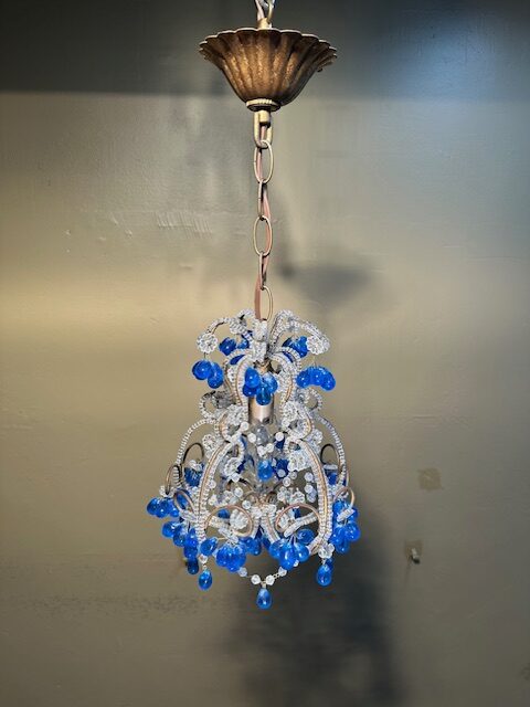 This is a lovely French Beaded Crystal Chandelier with cobalt blue bobbles. This petite chandelier has intricate detail throughout with cobalt blue bobbles and will add charm to any room.