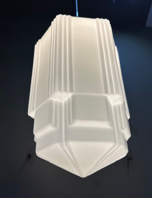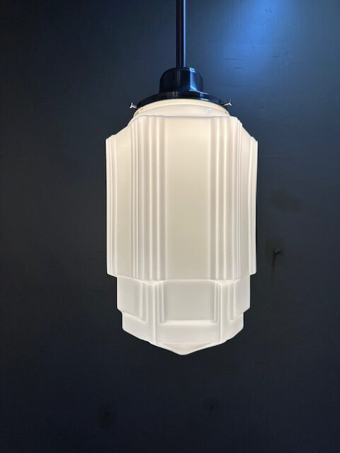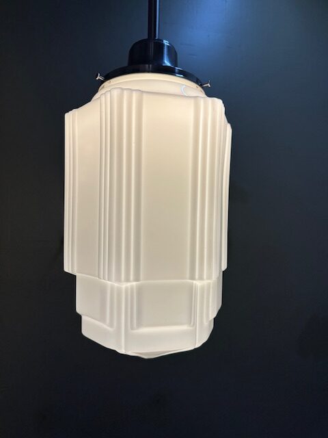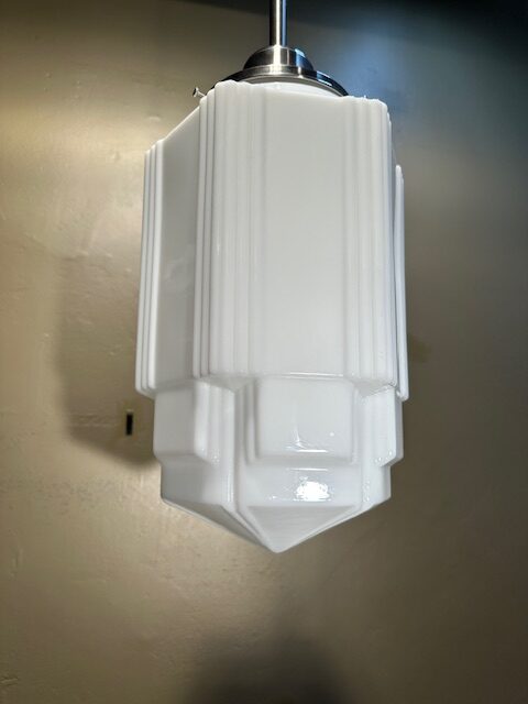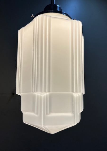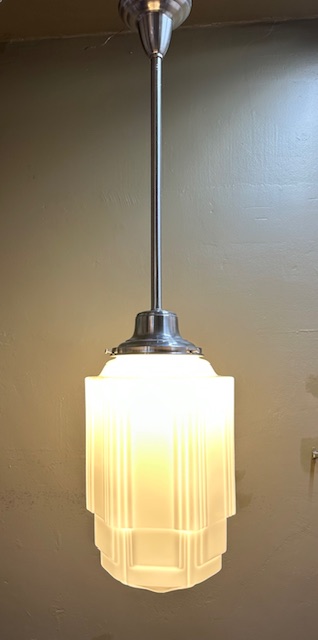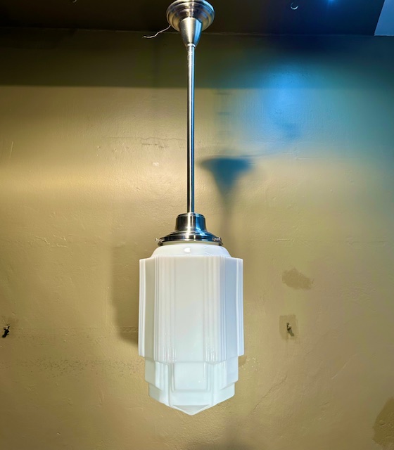 A great Art Deco skyscraper style pendant. This one dates from the 1920s/1930s. Shown here on nickel finished hardware however we have many other hardware options available both vintage and custom. Please call for current inventory.