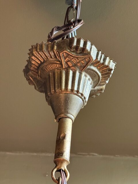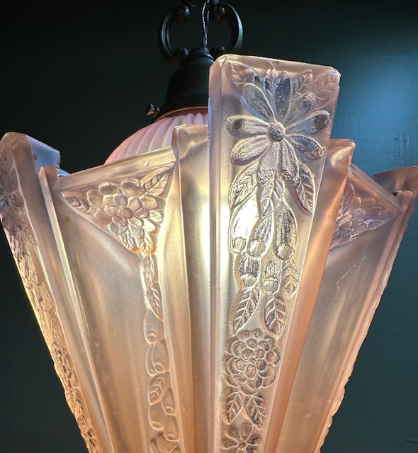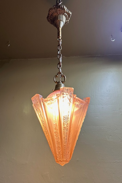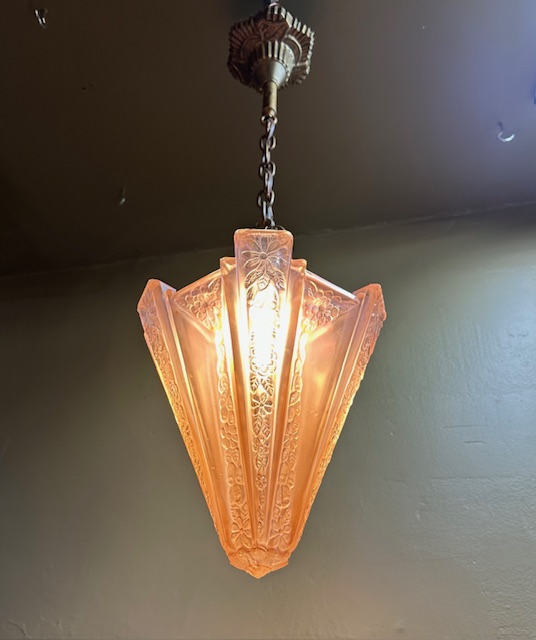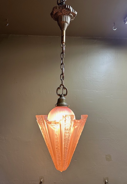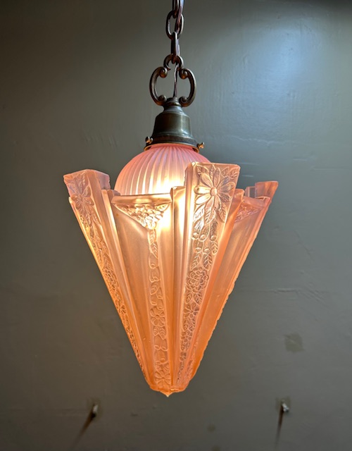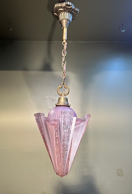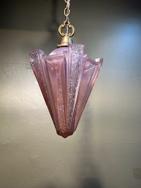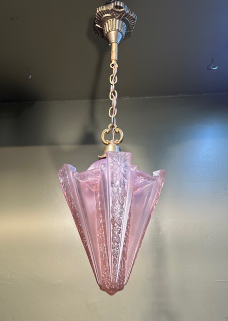 This is an extremely rare Consolidated Glass Co light fixture that dates from the 1920s and is in excellent condition. Part of Consolidated’s “Modernizer” line this is the very rare rose coloured glass version. Made in the USA taking inspiration from French art glass artists like Rene Lalique. Please call for full details.